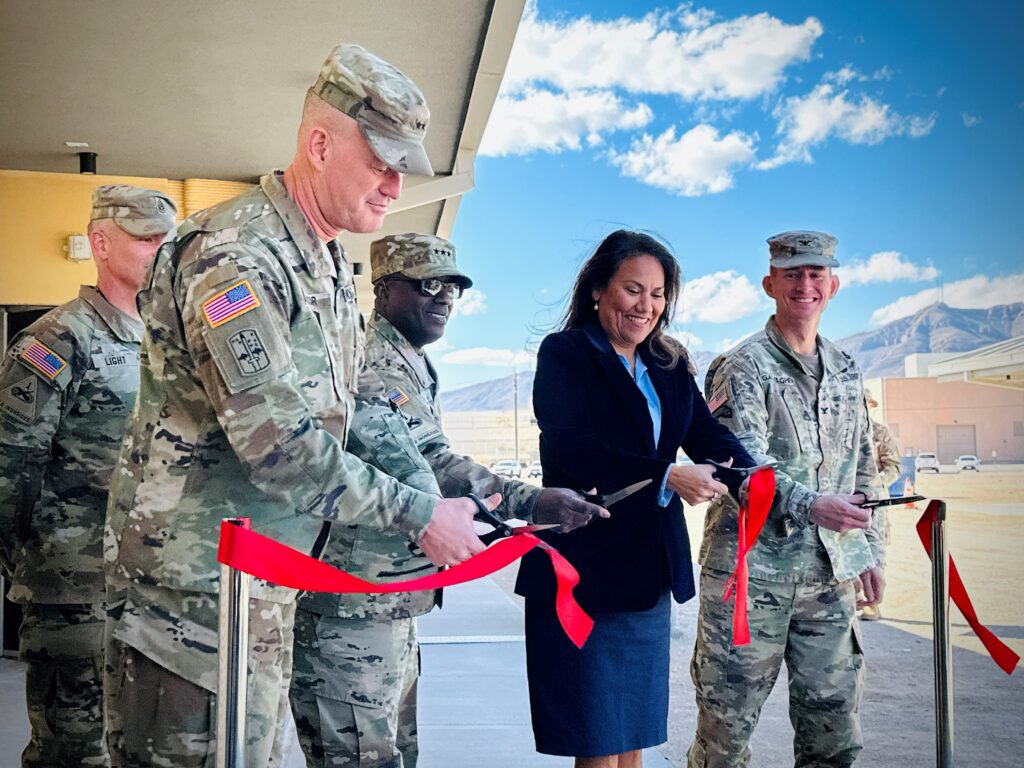 All images courtesy of CERL. Feature image: 1AD Commanding General Maj. Gen. Curtis Taylor ; Congresswoman Veronica Escobar and Fort Bliss Garrison Commander Col. Brenden Gallagher cut the ribbon for the largest 3D-printed barracks in the DoD.