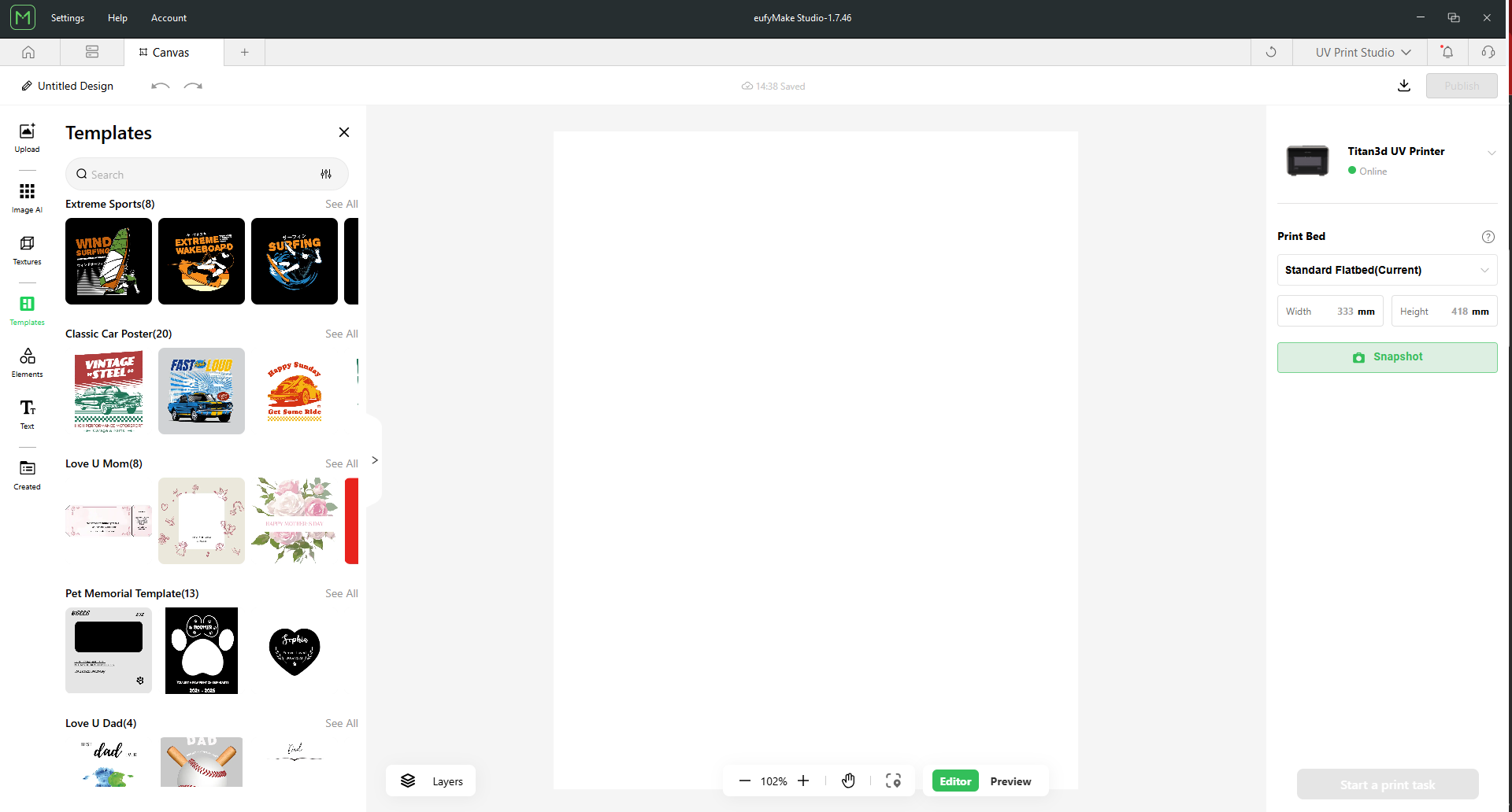The E1 uses a proprietary software suite called EufyMake Studio. It’s a fairly straight forward software that allows for some minor graphic design and image manipulation, but for real graphic design and image editing, you should stick with the Adobe suite, Corel suite, or something open source like Inkscape. With that being said, Eufy Studio allows you to select materials and choose the settings you want for your print, including using AI to automatically texture 2D images.