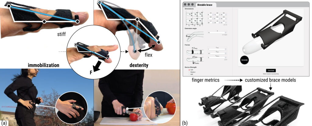 Figure 1: We present the design of a bistable brace that (a) enables easy switching between immobilization, when the hands are not actively used (e.g., running), and dexterity, when the hands are in active use (e.g., cutting vegetables). (b) Our customization design pipeline generates 3D-printable models tailored to individual finger metrics, including finger strengths.