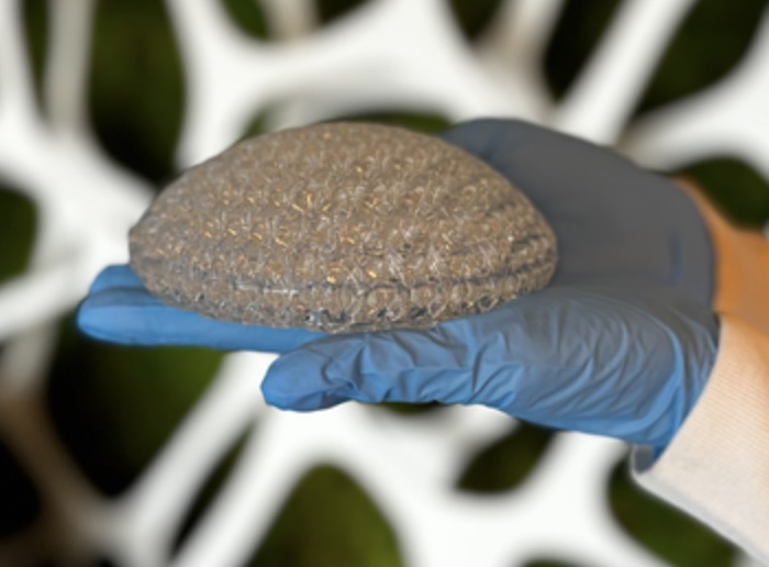 3D printed breast implant made with CollPlant’s rhCollagen-based bioinks on a Stratasys Origin printer. Image courtesy of Business Wire.