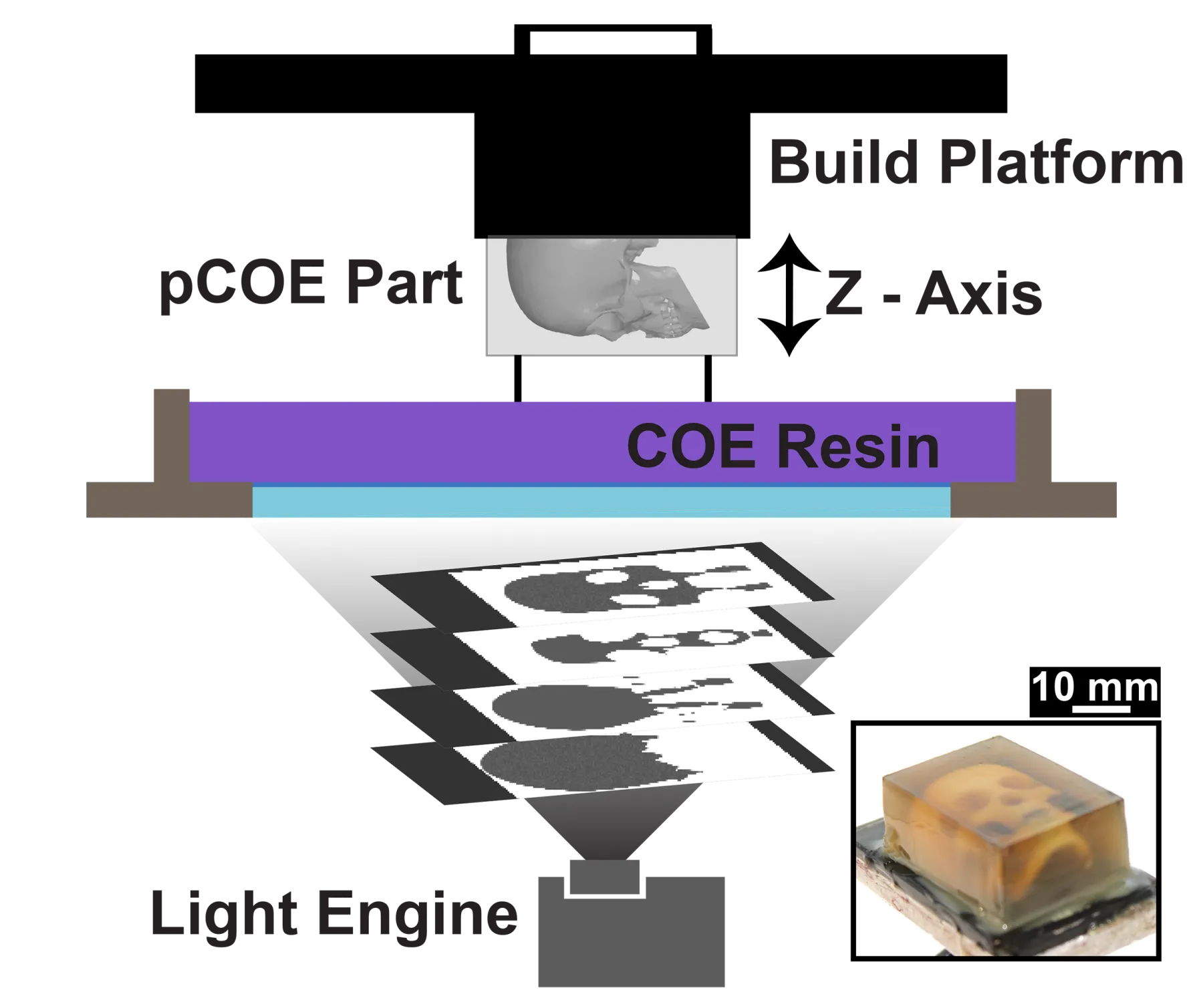 Schematic of the CRAFT method, illustrating the printing of a crystalline skull embedded within a more amorphous matrix. The method uses a commercial printer with varying patterns of light to transform a widely available liquid resin called cyclooctene into a solid plastic object. It involves projecting a series of grayscale images onto a platform that moves up and down in the liquid, building the object up from a series of microscopically thin 2D layers of polymeric material. Credit: University of Texas at Austin.