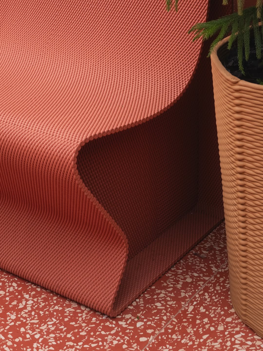The benches were printed from a bio-based, plant-fiber reinforced material. This choice supports sustainability goals and reflects Lululemon’s broader focus on responsible materials. The result is seating that feels strong and durable, yet visually soft and woven in appearance.