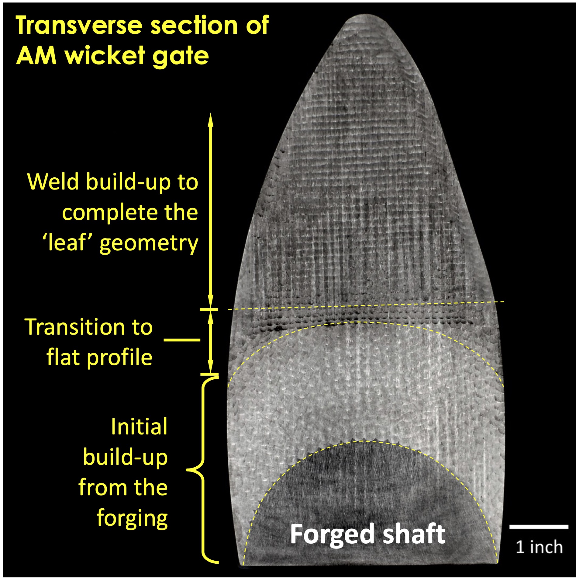 Hydropower components such as wicket gates, runners, and housings are often enormous, weighing hundreds to thousands of pounds. While small and midsized components have benefited from powder bed fusion additive manufacturing for years, the scale of hydropower applications makes powder bed processes impractical. Wire arc DED, however, can produce large components at industrially relevant sizes and deposition rates.