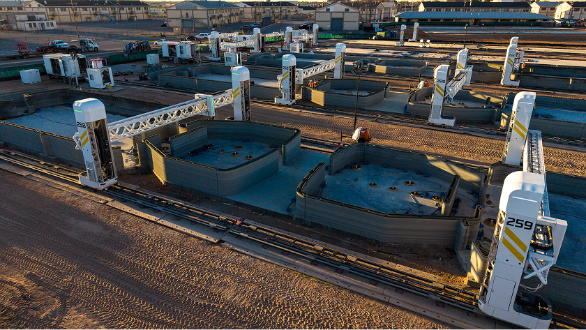 ICON’s large-scale 3D printers in operation, building multiple military structures simultaneously on-site.