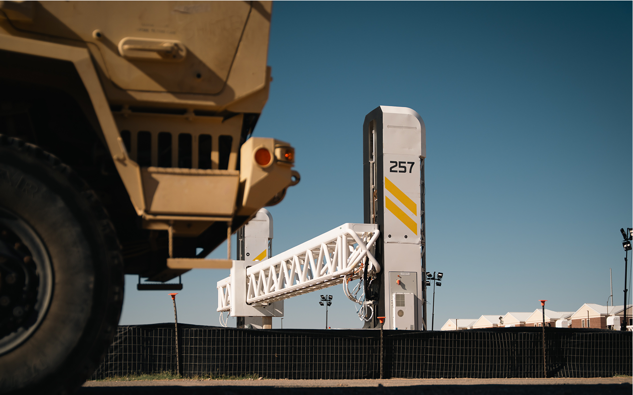 Close-up of one of ICON’s robotic gantry systems at a defense site.