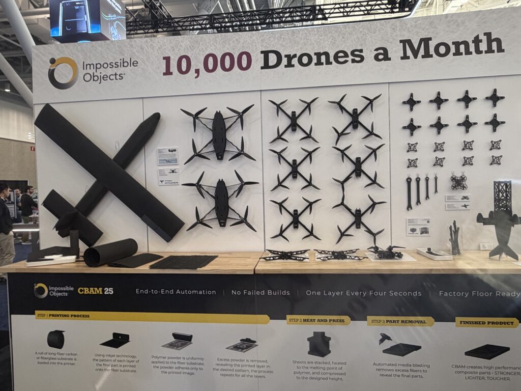 At the Impossible Objects booth, the company had a wall of 3D drones on display, which were printed on its incredibly fast CBAM 25 system. As you can see, Impossible Objects claims that it can print 10,000 drones a month with its composite-based AM technology.