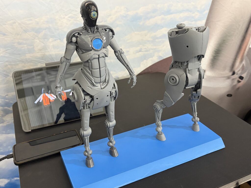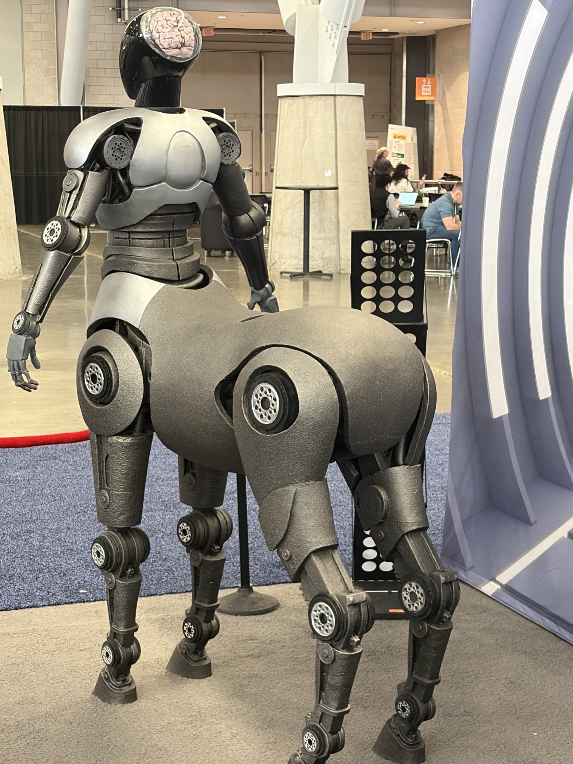 The idea is that the Centaur would be AI-powered, so it would be self-sufficient. The version at the booth was 3D printed out of plastic filament, but they are looking into printing a metal version some day.