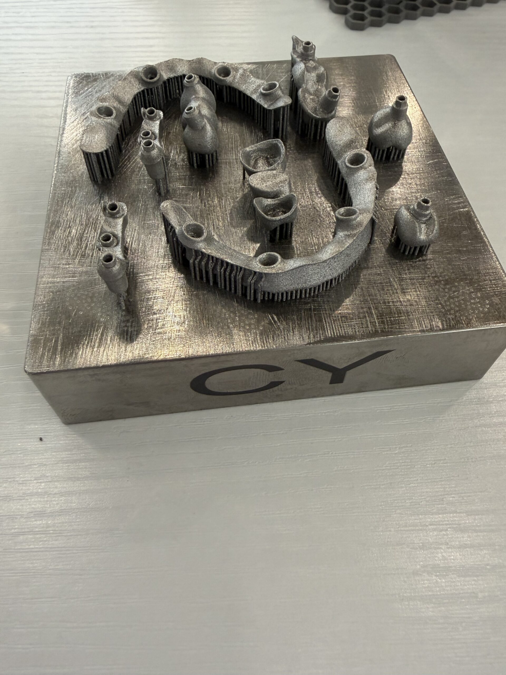 Then he showed me the desktop MX100, the company’s entry-level metal LPBF printer, which starts at an almost unbelievable $39,000. It features a 100 x 100 x 80 mm build volume, one 300 W laser, a “fast and reliable galvo scanner,” and 20-60 µm layer height. The printer is compatible with a variety of materials, including stainless steel, copper alloy, aluminum, titanium, Inconel, cobalt-chromium, and more.